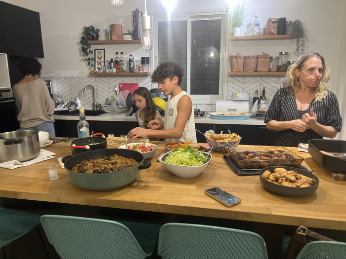 This image depicts an interior scene within a modern kitchen and dining area in a residence located in Alfey Menashe, Palestinian Territory. Four individuals are present, engaged in meal preparation or serving around a large wooden kitchen island. On the far left, an adult woman with dark, curly hair, wearing a light-colored, off-the-shoulder top and blue jeans, stands with her back to the camera, attending to items near a stainless steel sink. To her right, a young girl with long brown hair, wearing a light-colored top, stands observing the food on the island. Next to her, a young boy with curly dark hair, wearing a light-colored sleeveless top, is actively using a utensil to interact with food in a bowl on the island. On the right side of the island, an adult woman with blonde, wavy hair, wearing a striped short-sleeved top, stands facing left, with her hands clasped in front of her and her mouth slightly open, appearing to be speaking or gesturing. The wooden kitchen island is laden with a substantial meal. Prominently displayed are a large green pot containing a dark stew or casserole, a clear glass baking dish holding roasted vegetables and possibly meat, a dark grey bowl filled with roasted potatoes, a white bowl with mixed green salad, and another white bowl containing chopped tomato and cucumber salad. A basket with French fries and what appears to be fried fish is also present. A small shot glass containing clear liquid and a bottle of clear spirit (Absolut vodka) are visible on the island, alongside a smartphone with a reflective screen. The background kitchen features black lower cabinets, a white chevron-patterned tile backsplash, and wooden floating shelves adorned with various bottles, jars, and potted plants. A window is visible behind the counter. The area is illuminated by recessed ceiling lights and two pendant lights. Teal/turquoise chairs are positioned at the island, indicating a dining function. The scene suggests a familial gathering centered around food.