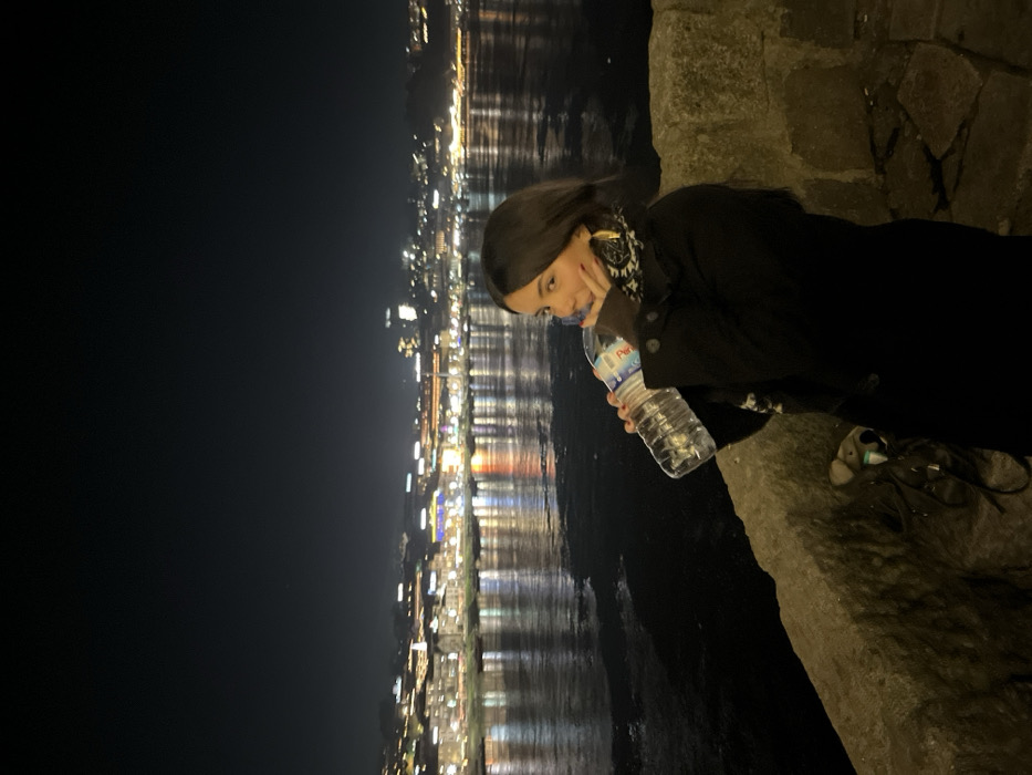 A young woman, dressed in black, leans against a stone structure at night. She holds a water bottle near her face and seems contemplative. Behind her, city lights reflect in the water, creating an atmospheric glow. The background is mostly dark, emphasizing the contrast between the illuminated city and the night sky. Her shoes are visible near the edge of the stone structure. The overall scene has a peaceful, urban night vibe.