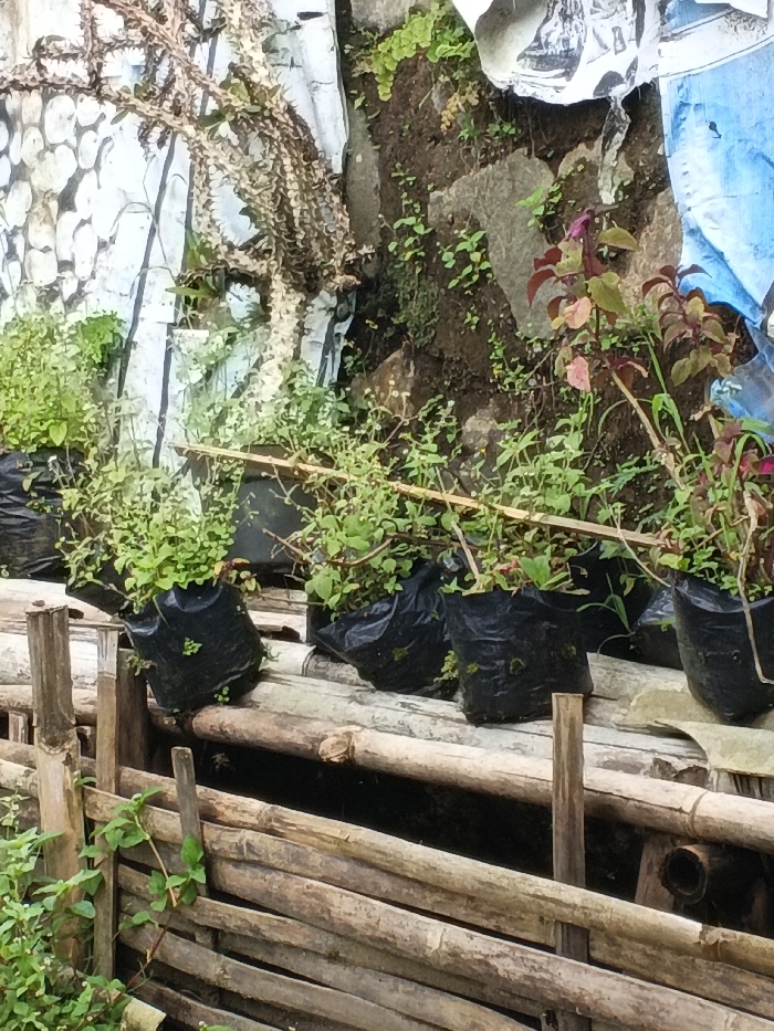 Black plastic bags containing leafy green plants line a bamboo structure. Behind, a textured wall rises, partially covered in more plants and a decaying white material. A dry, thorny plant clings to the left side of the wall. Some plants in the black bags have added support sticks, and some feature red and green leaves. The structure appears aged and partially worn, with some vines growing along its base.
