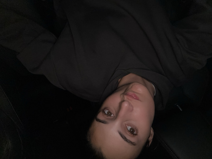 A single individual, appearing to be a young adult female, is depicted in a dimly lit interior environment, most likely a vehicle