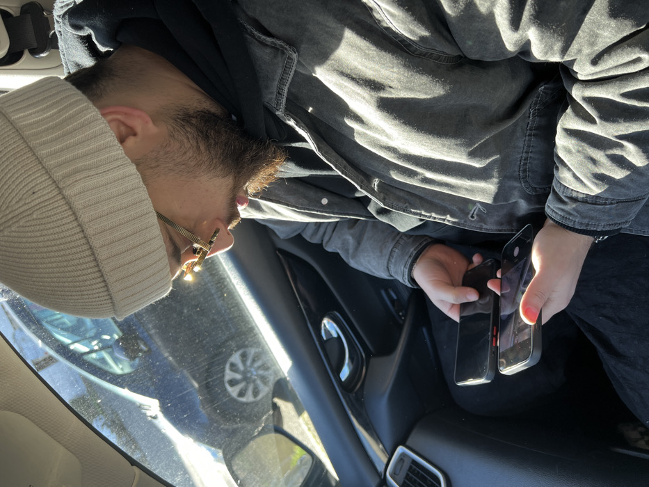 In Hérouville-Saint-Clair, France, a male individual is seated in the passenger seat of a vehicle, angled downwards. He wears a light beige knit beanie, gold-framed glasses, a dark hooded garment, and a faded dark grey jacket. Both hands hold black smartphones with dark screens. The top phone is held by his right hand; the bottom phone is held by his left hand, notable for its bright coral-painted thumb and index fingernails. Strong sunlight illuminates the scene, creating distinct highlights and shadows on the individual and the car's interior. Through the passenger window, a dark-colored vehicle is partially visible in the background.