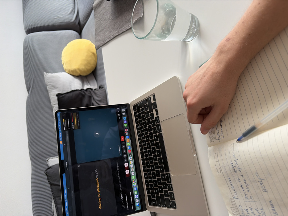 An indoor scene in Sofia, Bulgaria, captured from a first-person perspective, looking down at a white table