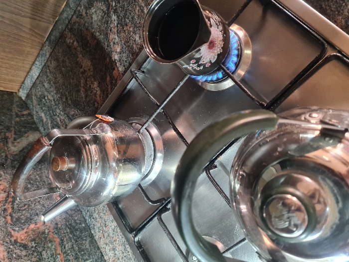 The scene depicts a kitchen in At-Tall, Syria. A stainless steel gas stove is shown with three cooking vessels positioned on its grates. In the foreground, a partially visible silver-colored metal kettle with a dark green handle rests on a burner. Another silver-colored metal kettle, equipped with a brown wooden handle and a small orange tag, occupies a central burner. To the right, a black metal coffee pot, adorned with white and pink floral patterns and containing a dark liquid, is actively heating over a blue gas flame on a third burner. The stove is situated against a dark, speckled granite countertop, above which a light brown wooden panel is visible. No individuals are present in the image.