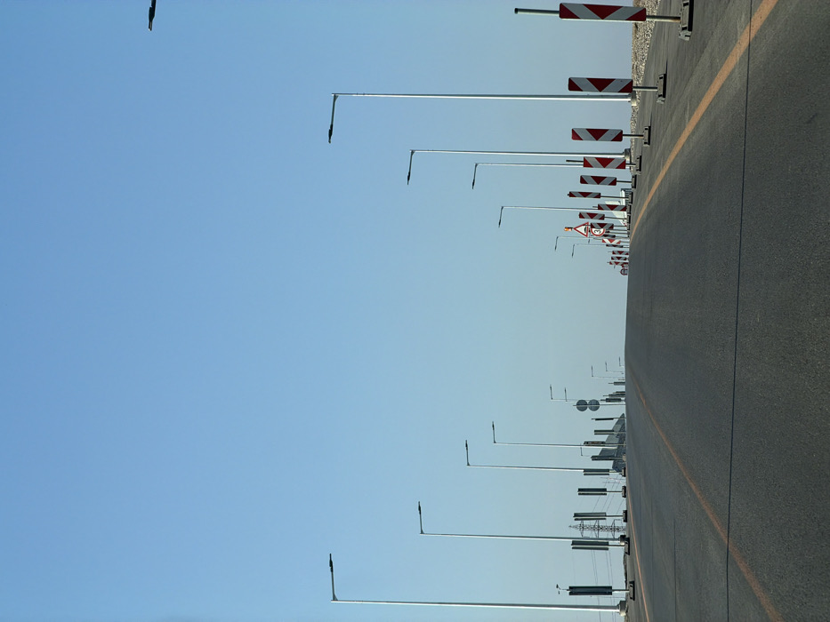 The image displays an unoccupied, two-lane asphalt road extending into the distance under a clear, light blue sky, located in the city of Slavyani, Bulgaria. A solid orange-yellow line delineates the right edge of the visible lane. No vehicles or individuals are present. Along the left side of the roadway, numerous streetlights with reflective silver-colored poles and dark horizontal luminaires are evenly spaced, receding into the background. Further down the left, an electricity pylon, several dark rectangular vertical panels, and two circular signs are observable. The right shoulder of the road is marked by a series of red and white diagonal striped hazard delineators, each mounted on a dark, square base, extending into the distance. Among these delineators, at least two triangular warning signs featuring a black numeral '30' on a white field are visible. The unpaved right shoulder consists of light-colored aggregate. The road exhibits a gradual upward incline towards the horizon.