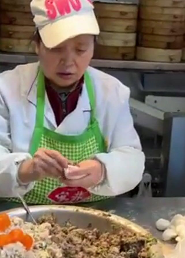 two women making dumplings in a restaurant kitchen. The first woman, wearing a white lab coat, a green apron with a checkered pattern, and a white baseball cap with pink writing, stands in front of a large bowl filled with a mixture of chopped ingredients. She is shown taking small balls of dough and shaping them into dumplings. The bowl also contains bright orange circular objects. Stacks of bamboo steamers are visible behind her. The woman speaks in a quick, conversational tone. Another woman in a white lab coat, orange apron, and hairnet is shown taking finished dumplings from the bowl and placing them into the bamboo steamers. The kitchen is clean, with stainless steel counters and white tiled walls. The focus is on the dumpling-making process, showcasing the skill and efficiency of the women.