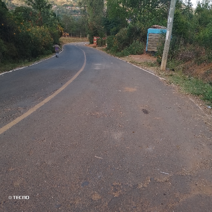 A winding asphalt road with a yellow dividing line curves gently through a lush, green landscape. Trees and shrubs border both sides, with a small, blue-topped structure visible amidst the foliage. A lone figure, likely a person, is seen far down the road walking. A utility pole stands near the road's edge on the right. The road surface is marked with minor stains and debris. The overall scene suggests a rural or semi-rural setting.