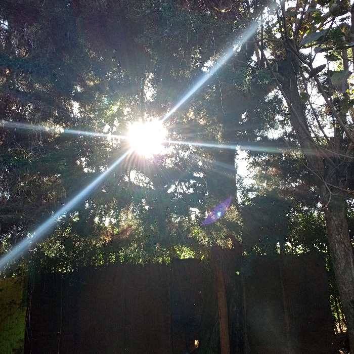 The scene is located outdoors in Ndeiya, Kenya. A prominent sunburst with distinct rays originates from the upper-left-center, indicating direct sunlight through dense tree foliage. The upper portion of the frame is filled with dark green, coniferous-type tree branches and leaves, with some lighter-leaved deciduous branches on the right. Below the foliage, a dark, horizontal barrier, consistent with a fence or wall, occupies the lower third of the image, largely in shadow. A purple-blue lens flare is visible in the lower right quadrant, accompanying other smaller light artifacts. No human figures or specific activities are depicted.