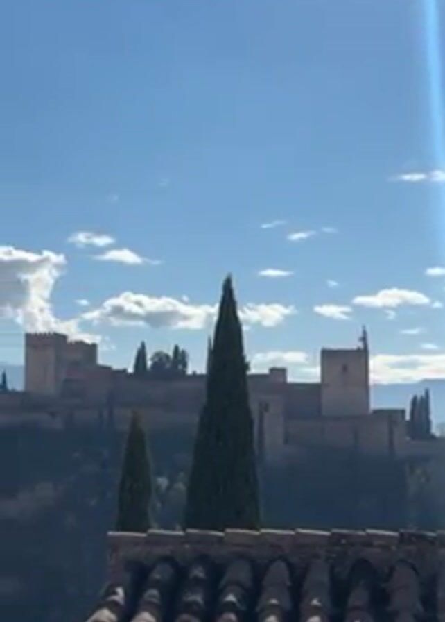 The video presents a daytime view of a hilltop castle or fortress from slightly below, possibly from the rooftop of a nearby building