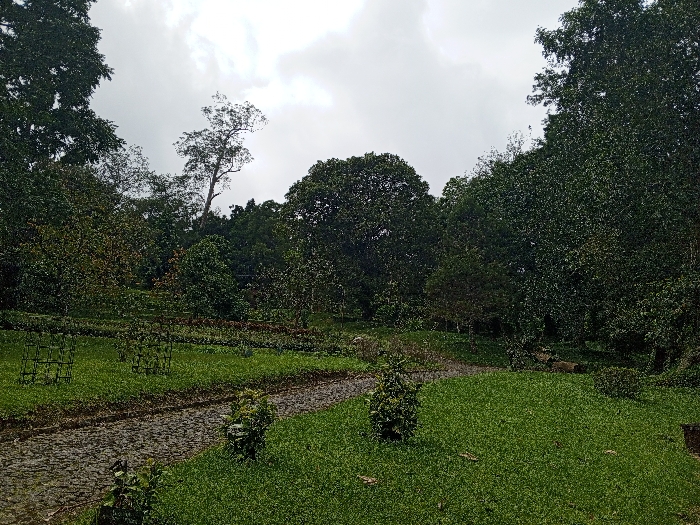A lush green garden, partly on a slope, features well-manicured grass in the foreground. Young plants, some in protective cages, cover the sloped area. A muddy path or field divides the grass from these plants. Dense trees form a backdrop, their foliage obscuring much of the sky, which is overcast with grey clouds, suggesting a cloudy day.