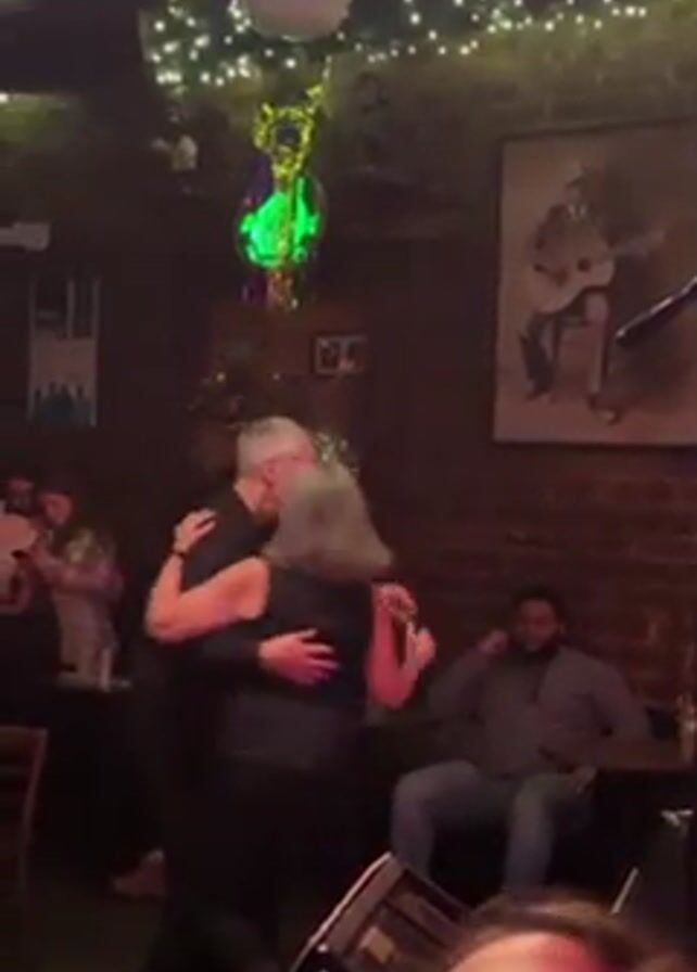 couple dancing at a bar. The man and woman are dressed in black and have gray hair. They are dancing close together, and the man is leading. The bar is dimly lit, with string lights and a disco ball hanging from the ceiling. There are other people seated at tables in the background, some watching the couple. A painting of a musician with a guitar is visible on the brick wall. The atmosphere is lively and intimate.