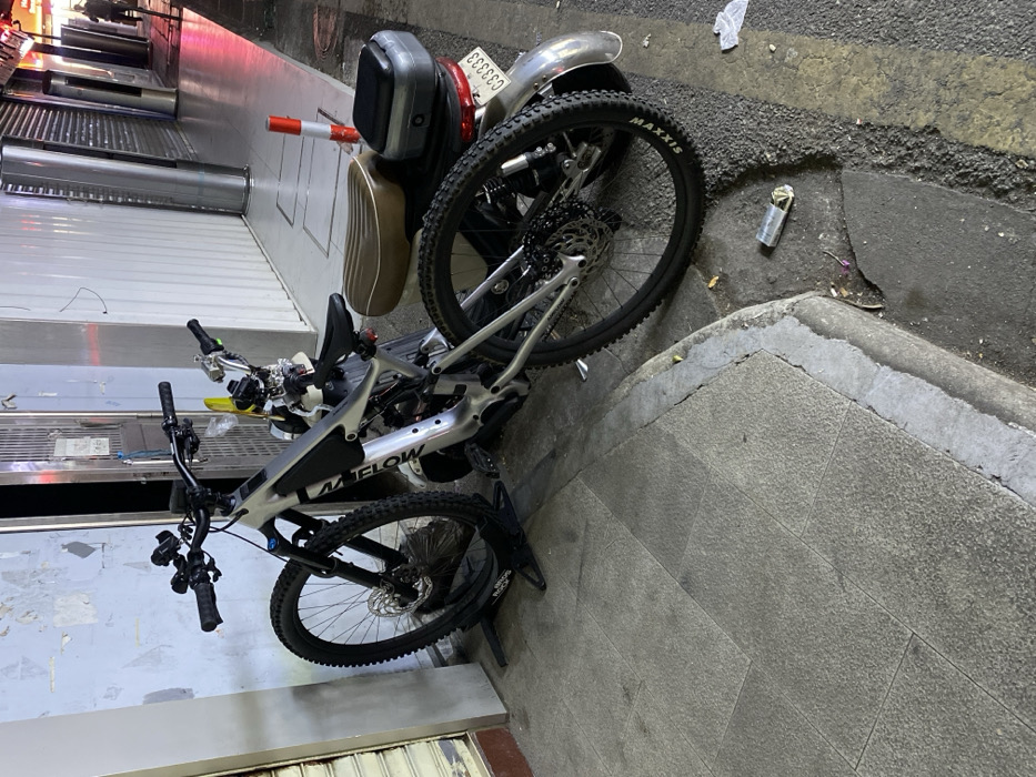 This image depicts a nighttime urban scene in Yuexiu District, China. The foreground features a paved sidewalk and an adjacent street/alleyway. On the sidewalk, a silver-colored full-suspension MAFLOW electric mountain bike is parked upright on a black metal bike stand. The bike has black handlebars with multiple accessory mounts, a black frame bag, and large knobby tires (MAXXIS branding visible on the rear tire). To the right of the e-bike, a white or light-colored electric scooter or small motorcycle is parked. It features a brown, ribbed seat, a black rectangular storage box mounted on a rear rack, and a metallic rear fender with a license plate reading "C33333." The sidewalk consists of grey rectangular paving slabs, showing signs of wear. A raised curb separates the sidewalk from the darker asphalt or concrete street, which has a faded yellow line running parallel to the curb. Litter, including a crushed silver beverage can and a crumpled piece of white paper, is visible on the street surface near the curb. A red and white striped cylindrical bollard stands on the curb behind the scooter. The background shows the facade of a building. On the left, a closed grey metallic roller shutter is visible, consistent with a storefront. To its right, a dark, narrow doorway leads into the building. Further right, the building's exterior transitions to lighter-colored, possibly white or light grey, metal paneling, also appearing to be closed commercial units with additional roller shutters further down. The scene is illuminated by artificial light, casting soft shadows, with notable red light reflections visible on the ground in the distant portion of the street. A faint, dark silhouette of a person is discernible in the far distance, moving away from the viewer.