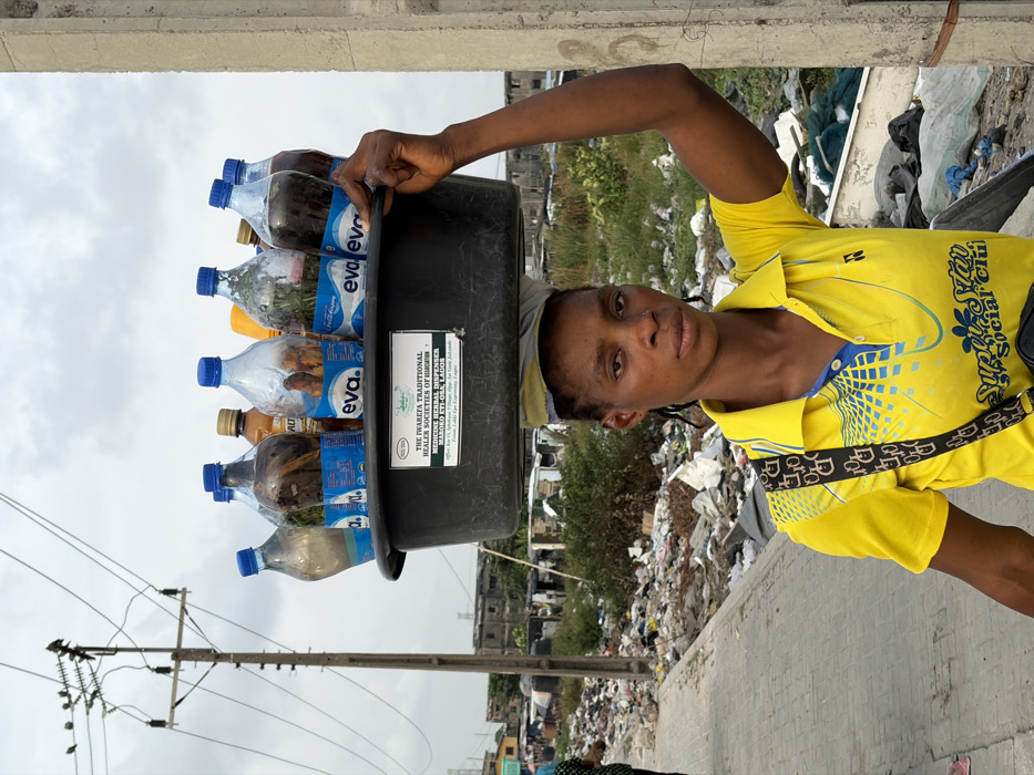 An outdoor, eye-level shot in Igboefon, Nigeria, depicts a dark-skinned woman carrying a black plastic basin filled with various bottles on her head