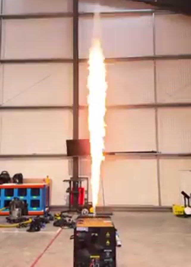 A device emitting two large bursts of fire is in the center of the screen. The device is black and on top of a gray case with handles. In the background is a large corrugated metal warehouse. To the left of the machine is a blue and orange storage cabinet. Behind the machine is a black tv mounted on a red rolling tool cart, a white board, and a variety of other tools and items. The camera is stationary and level with the horizon.