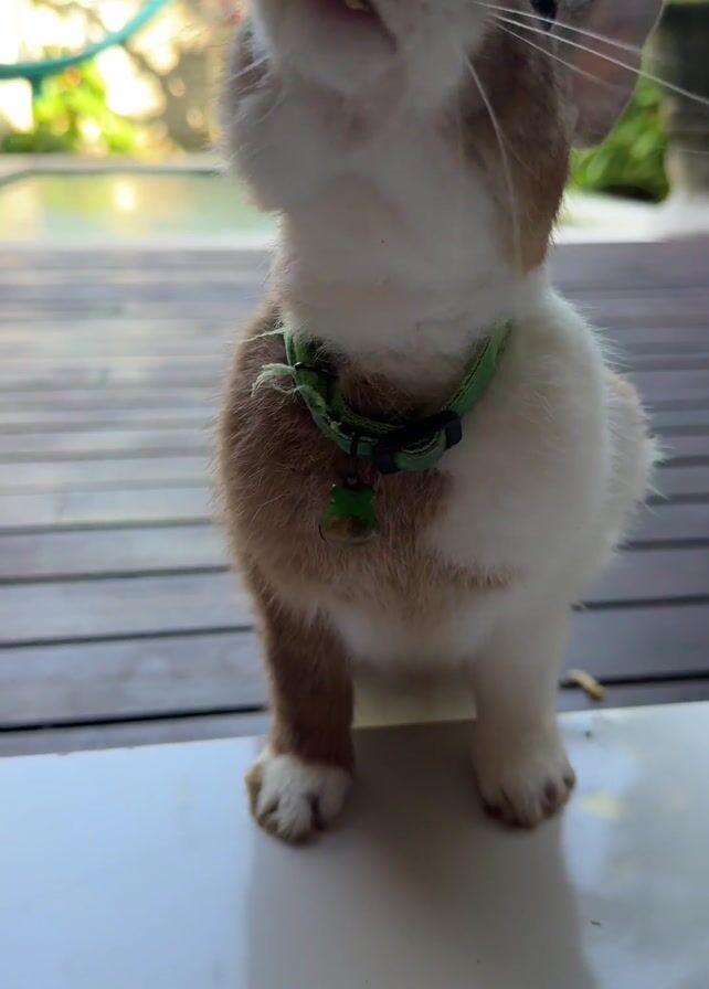 A close-up shot shows a white and brown rabbit being hand-fed a piece of food. The rabbit stands on a white surface in front of a wooden deck, its mouth open to receive the offering. The hand holding the food, with red fingernails, is just out of focus. The rabbit wears a green collar with a small bell. The background features out-of-focus greenery. The rabbit's nose and whiskers are prominent in the frame.