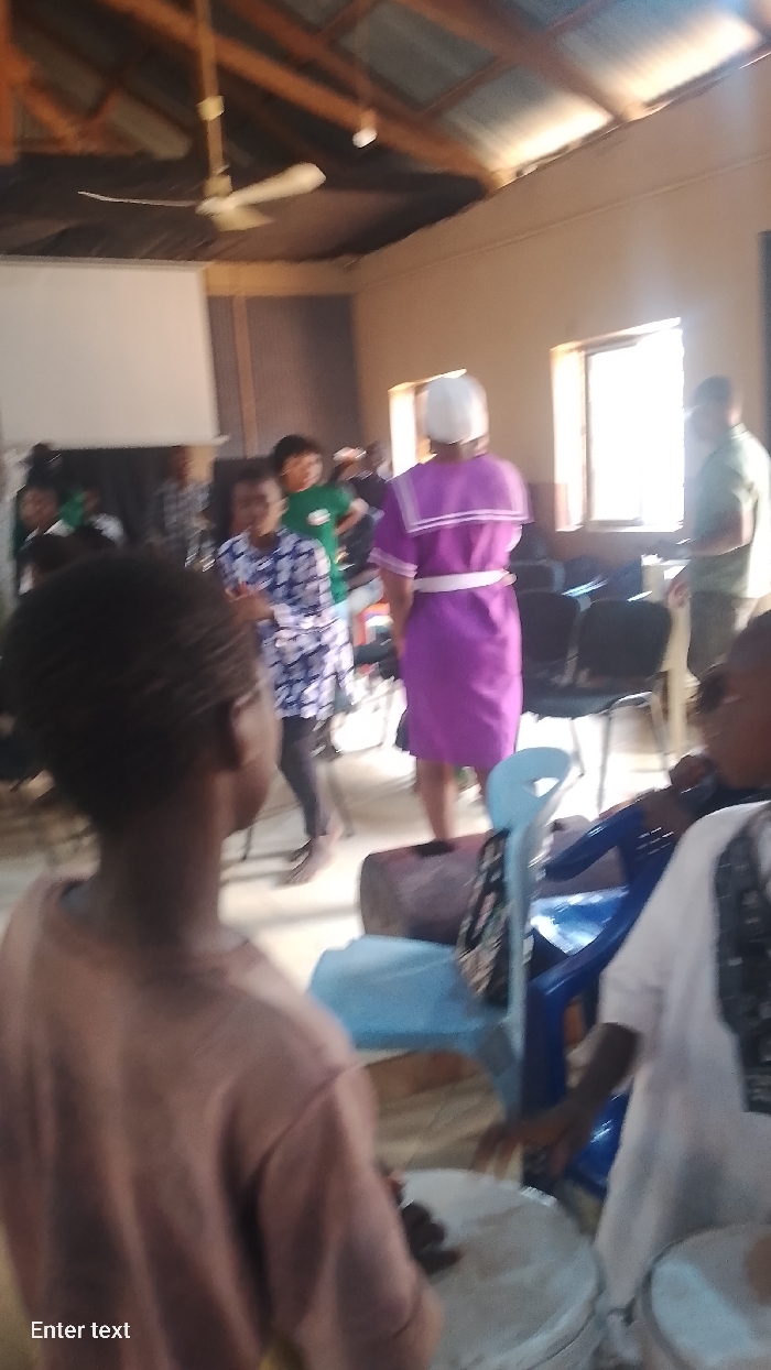 The image depicts an indoor gathering within a building in Akwanga, Nigeria