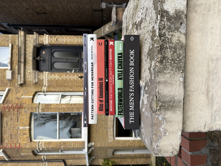 A stack of six books is centered on a weathered, light-colored stone wall or pillar in an urban residential setting. The stone exhibits discoloration, chipping, and peeling surface material. Beneath the bottom book, a thin, folded paper or magazine is partially visible. The books, from top to bottom, are identified as: 1. White spine: "PATTERN CUTTING FOR MENSWEAR" by Gareth Kershaw. 2. Red spine: "Atlas of Anomalous AI". 3. Black spine: Small white text including "Maison Margiela" and "JDH". 4. Black spine: "ADVERTISING FOR PEOPLE WHO DON'T LIKE ADVERTISING." by KesselKramer. 5. Green spine: "FILTERWORLD" by Kyle Chayka. 6. Black spine: "THE MEN'S FASHION BOOK". The background features a three-story residential building, consistent with Victorian or Edwardian terraced housing in the City of London, United Kingdom. The building is constructed from yellow-brown London stock brick, featuring prominent bay windows on the ground and first floors. A dark, paneled front door with the house number "69" clearly visible above it is positioned in the center of the background. Bright daylight illuminates the scene.