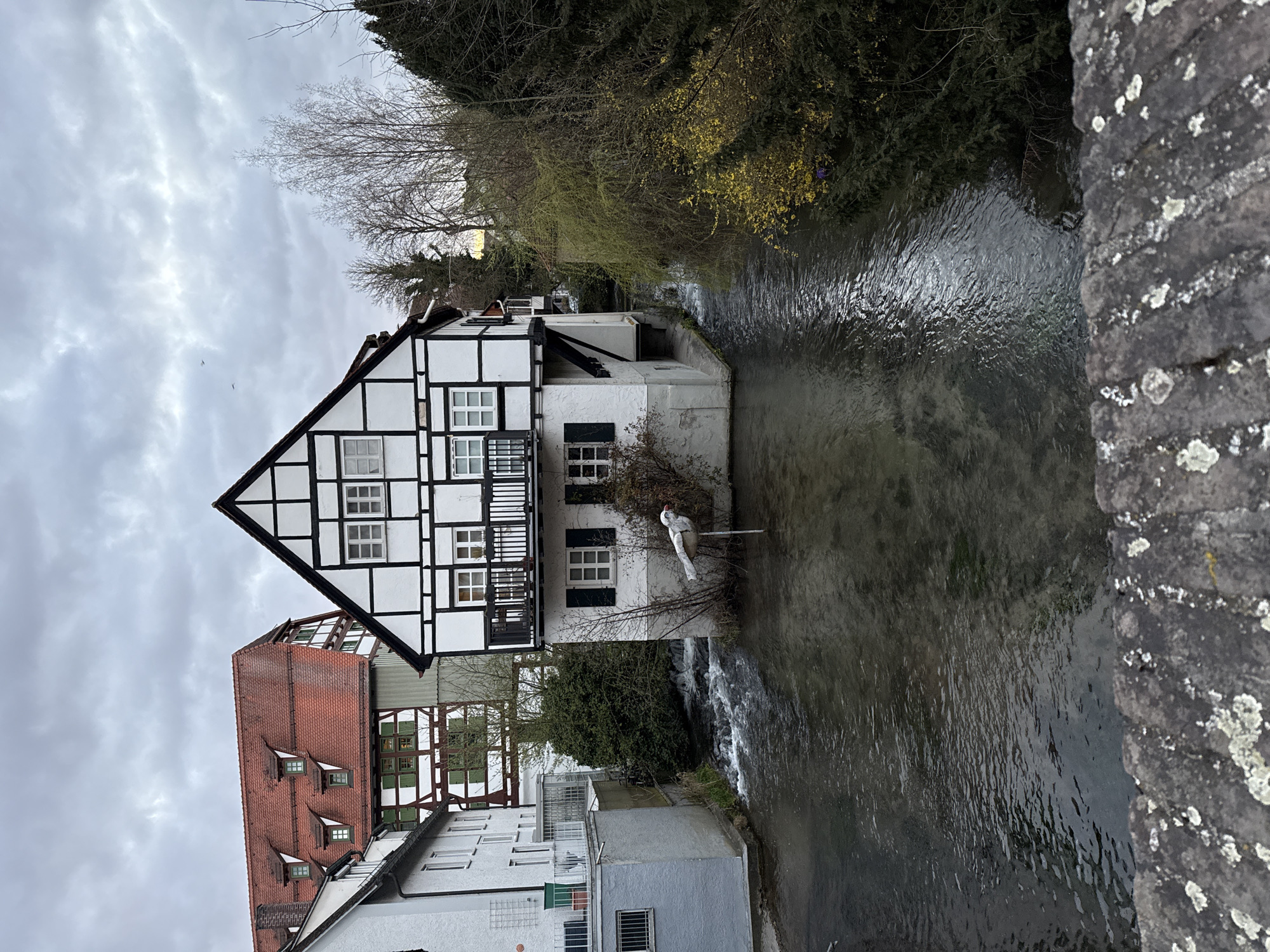 The image depicts a scene in the Fischerviertel of Ulm, Germany, focusing on a historic half-timbered house built directly over the Blau River. The central structure features white plaster infill with dark timber framing, a steep gabled roof with dark tiling, and multiple rectangular windows with white frames and some dark green shutters. A small balcony with a black metal railing extends from the second story. The lower walls are light grey, appearing to form a foundation partially submerged in the flowing, dark water of the river. To the left, a white building with a grey base and a metal fence is visible, with another half-timbered house featuring a red tiled roof and several green-shuttered dormer windows positioned further back. A white, stylized bird sculpture, consistent with a stork or heron, stands on a vertical pole emerging from the river near the central house's foundation. The river itself exhibits ripples and appears shallow in sections. Vegetation includes several bare deciduous trees, green coniferous trees, and a bush with yellow blossoms on the right riverbank. The sky is overcast with a uniform layer of grey clouds. Two faint, dark avian shapes are visible against the sky near the top center. The perspective is from a stone bridge, with a lichen-covered dark grey stone wall occupying the immediate foreground. No human figures are present in the scene.