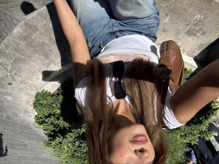 A female subject with long brown hair is captured from a high-angle, close-up perspective, situated outdoors in Florence, Italy