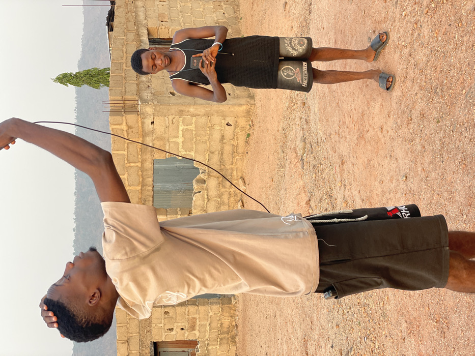 The scene in Lokoja, Nigeria, depicts two young adult males on reddish-brown dirt ground