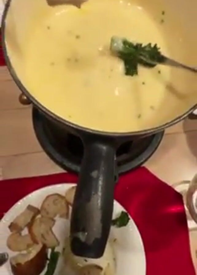 - "fondue pot with melted cheese sitting on a burner on a wooden table covered with red tablecloths" by FM-8uZDn2, licensed under CC BY 4.0