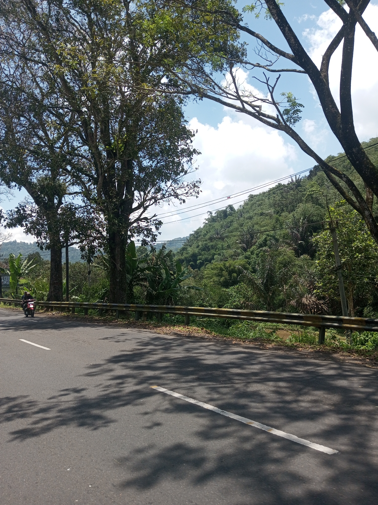 road in Kioumaknao 2, Laos. The road is asphalt and has a white line marking the lane. There are trees alongside the road, casting shadows on the surface. A metal guardrail runs parallel to the road, separating it from the lush vegetation. A hill covered with dense forest rises in the background. A motorcycle is visible on the road. Power lines stretch across the sky. The sky is partly cloudy.