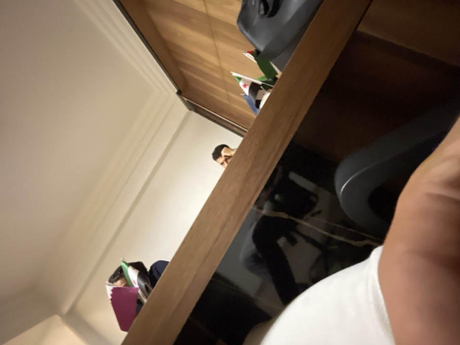 The image portrays an indoor scene within the Al-Muhajerin Municipality, Syria, captured from a low angle looking upwards over a dark wooden desk or counter. In the immediate blurred foreground, a light-colored garment and a dark, curved object, possibly an armrest, are partially visible. A prominent dark wooden surface horizontally crosses the middle of the frame, serving as a barrier. Below this surface, a reflective dark panel shows indistinct reflections, including structural elements. Behind the wooden surface, two individuals are visible. On the left, an individual is largely obscured by a magenta-colored object, possibly a folder or bag, and a green item, with dark clothing partially discernible beneath them. On the right, a second individual, a male with dark hair, is seen from the upper face and head, resting his chin on his right hand. Positioned on the wooden surface to the right of the second individual are several small flags. One flag is clearly identifiable as the Syrian opposition flag, featuring horizontal green, white, and black stripes with three red stars in the white band. Other miniature flags are present but less distinct. A dark, undefined object, possibly a bag or electronic device, sits further to the right on the same surface. The background consists of light-colored walls on the left and a wooden-paneled wall on the right. The ceiling is light-colored and features crown molding.