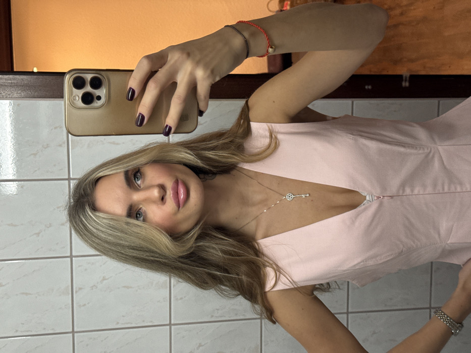 The image depicts a young adult female taking a mirror selfie indoors. The woman has long, layered blonde hair, blue eyes, and is wearing light pink lipstick. She is dressed in a light pink, sleeveless top or dress with a deep V-neckline, revealing a white garment underneath. On her left wrist, she wears a silver-toned metal watch. Around her neck is a silver-toned necklace with a key-shaped pendant adorned with small gems. Her right hand, with dark plum-colored manicured fingernails, holds a gold-colored smartphone featuring a triple-lens camera, capturing her reflection. On her right wrist, she wears two thin bracelets: one dark and one red cord with a small, light-colored bead. Her left hand rests on her hip. The background consists of a light-colored, square-tiled wall with dark grout lines. To the right, a dark brown door frame is visible, leading to an area with an orange-toned wall or indirect lighting. Assuming the location is in Berlin, Germany, as specified, the specific address or landmark within the city is not discernible from the visual evidence; the scene represents a generic interior, possibly a private residence or commercial establishment's restroom/dressing area.