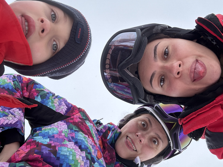 Three individuals are depicted from a low-angle perspective, positioned against an undifferentiated bright white sky, indicative of an outdoor, overcast winter environment in Ayas, Italy