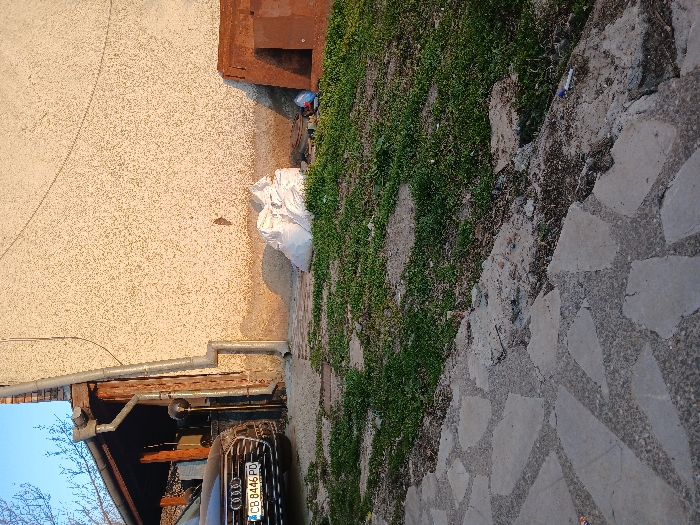 The image depicts an exterior scene in Ruptsi, Bulgaria, characterized by a textured, light-colored building wall under sunlight, casting shadows. To the left, a dark-colored Audi vehicle, license plate CB 8446 PD, is partially visible, parked beneath a wooden awning supported by vertical beams. A metallic downspout runs vertically along one of these wooden supports and extends downwards along the wall. Near the base of the wall, slightly right of the downspout, a cluster of white bags is piled on the ground. Further to the right, a stack of reddish-brown rectangular objects, possibly wooden panels or boards, leans against the wall. Below these objects, a small blue container and other miscellaneous debris are present. The foreground consists of a partial paved surface made of irregularly shaped grey flagstones set into concrete, showing signs of wear and cracking. Adjacent to this pavement is a patch of sparse green grass and exposed soil, leading towards the building wall. No individuals are present, and no actions or interactions are depicted within the frame. The lighting suggests either early morning or late afternoon, with direct sunlight illuminating the wall and casting shadows from the objects.