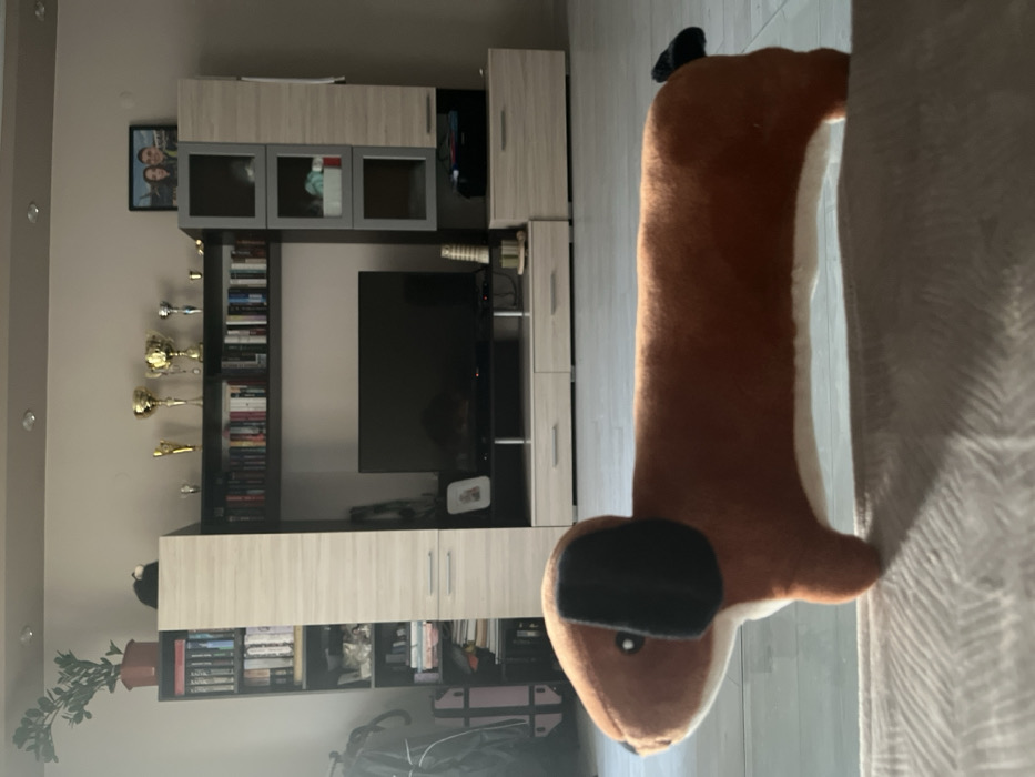 The scene depicts the interior of a residential living room in Plovdiv, Bulgaria. No individuals are visible. In the foreground, a large, brown dachshund plush toy with black ears, black eyes, and a white underside is positioned on a light-colored, textured surface, facing left. The background features a multi-component entertainment unit constructed from light wood-grain panels and dark shelves, situated against a light-colored wall. A black flat-screen television is centered on a dark media stand, with light wood-grain drawers beneath it. Above the television, shelves are filled with numerous books. Eight trophies, predominantly gold in color, are displayed on the uppermost shelf. To the far left of the unit, a tall cabinet supports a potted plant and is positioned next to a black backpack and a pink-striped wheeled case. To the far right, another tall cabinet features three square compartments and has a framed photograph of two individuals on its top surface. The room's floor is a light, smooth material, and recessed lights are visible in the ceiling. No actions or interactions are depicted in this static scene.