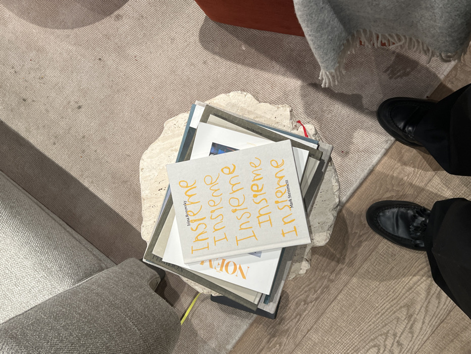 A stack of books sits atop a small stone table on a carpeted floor. The top book has the word "Insieme" repeated in orange text. A red-brown object and a grey blanket are partially visible. Black leather shoes and dark trousers are near the table's edge. Part of a grey sofa is in the left corner of the image.