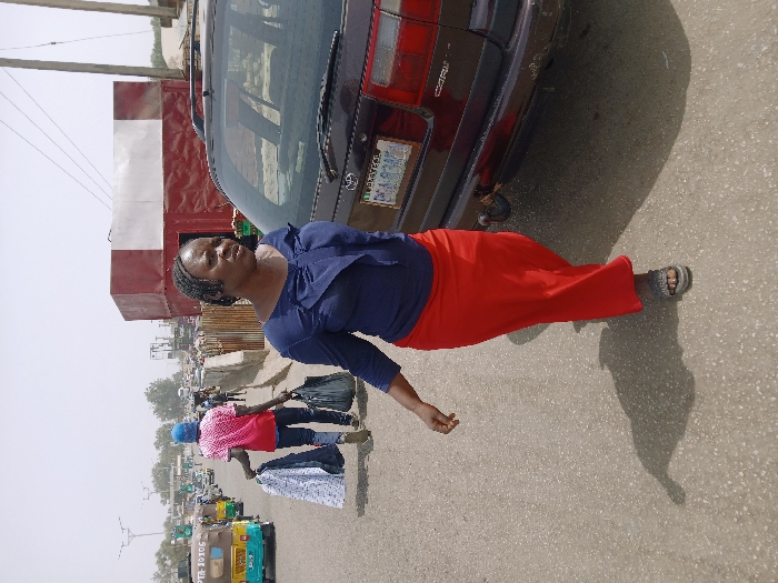 The image depicts an outdoor street scene, described as being in Kadoma, Zimbabwe, under bright, possibly hazy sunlight. In the foreground, an adult female with dark skin and braided hair walks towards the left side of the frame. She wears a dark blue long-sleeved top with a bow-like detail on the front and a long, flowing red skirt, paired with dark sandals. Her head is turned slightly to her right, and she appears to be looking forward. She casts a distinct shadow to her right. Immediately to her right, a dark-colored Toyota Corolla station wagon is partially visible, parked on the road. Its rear license plate, "BRA 9243," is partially legible. The car has a trailer hitch assembly visible beneath the bumper. In the midground, behind the woman, a male figure walks away from the camera, carrying several patterned fabric items in his left hand and a dark bag in his right. He wears a red patterned t-shirt, dark trousers, and a blue cap. Further left and behind him, a light blue and yellow three-wheeled vehicle (auto-rickshaw/tuk-tuk) with "PTA 10106" visible on its side is parked or moving slowly. Other vehicles and pedestrians are visible in the distant background, along with streetlights and utility poles. On the right side of the frame, behind the parked car, a large, rectangular structure, possibly a shipping container, is visible; it is painted red with a large white band across its top. The road surface is asphalt, and the sky in the background appears light and hazy.