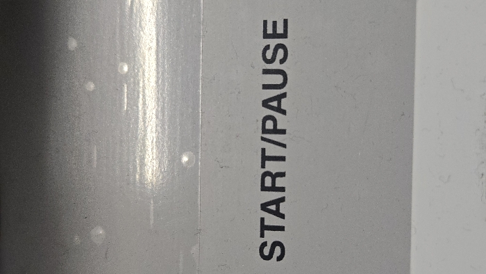 The image depicts a close-up, vertical view of a light gray control panel surface in Lompoc, United States. The text "START/PAUSE" is rendered in black, sans-serif uppercase letters, centered horizontally in the lower portion of the frame. The surface exhibits a fine texture with visible dust particles and several scattered, irregular circular light reflections, predominantly in the upper half. A faint horizontal line or seam runs across the frame approximately one-third from the top, separating a slightly darker gray area above from the lighter gray section containing the text below. No people, active subjects, or specific interactions are present.