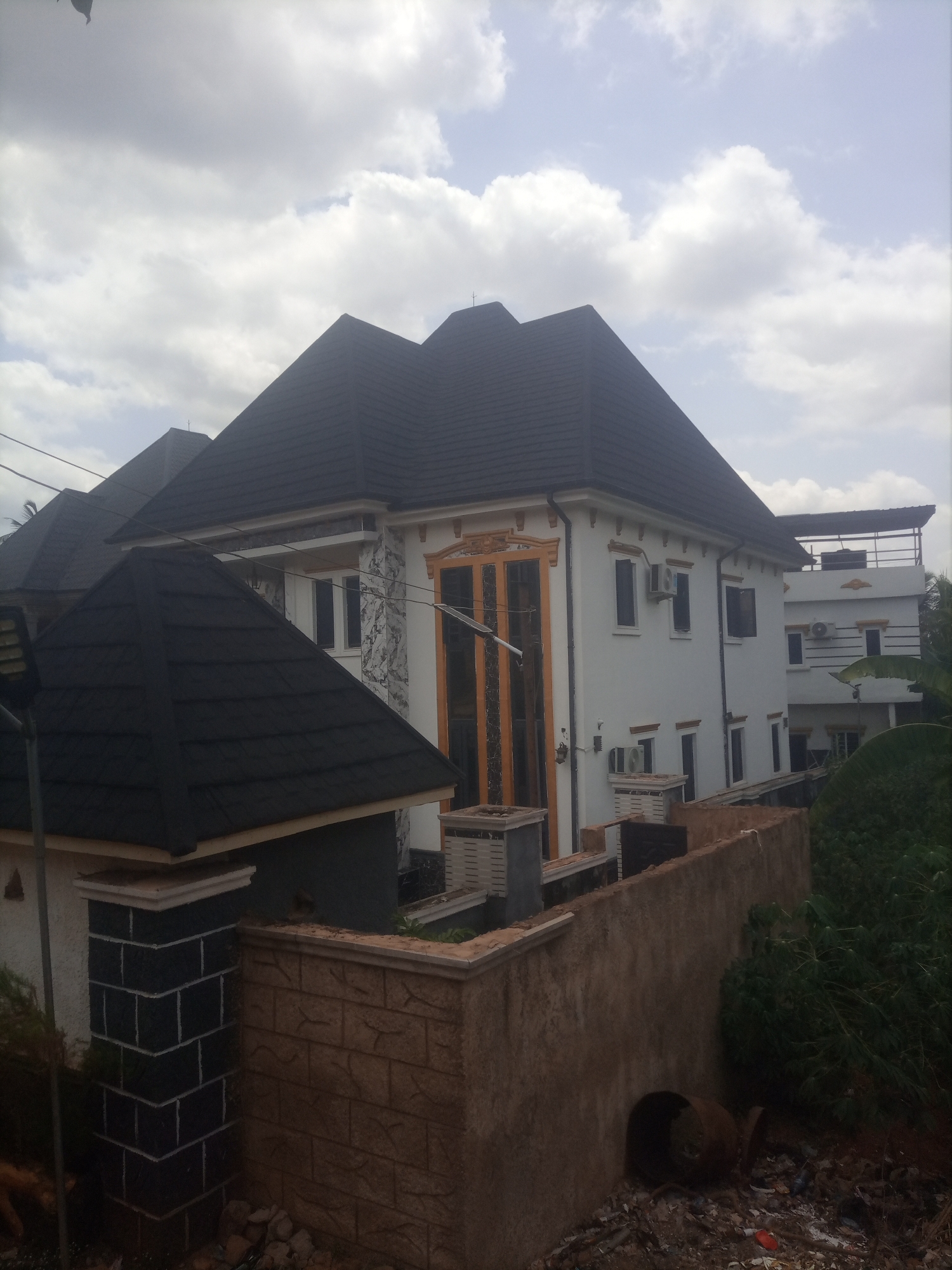 The image depicts a residential scene in Alor, Nigeria, under a partially cloudy sky. In the foreground, an unpaved area of loose soil and rocks contains scattered debris, including a rusted metal object and various discarded items. This area is bordered by a low perimeter wall. The wall's left section features black and white patterned brickwork, while the right section is a rough-textured, light brown stucco finish, at the base of which an open culvert is visible. Behind the wall, the primary structure is a multi-story building with white painted walls, accented by gold-colored decorative trim and textured grey-and-white panels. It features a dark, multi-faceted hip roof constructed from what appears to be stone-coated steel tiles. The building displays multiple rectangular windows with dark frames and several external air conditioning units mounted on its facade. A tall, multi-paneled feature, likely a large window or door with an amber tint, is centrally located on the front. Overhead electrical wires cross the scene. To the immediate left, a smaller ancillary structure with a dark hip roof similar to the main building's roof is partially visible, alongside a grey pole supporting a light fixture. In the background, to the right of the primary building, a second multi-story white building with a flat roof and an exposed rooftop utility structure is present. Dense green foliage is visible behind the wall and around the buildings on the right side. No individuals or active interactions are observed.