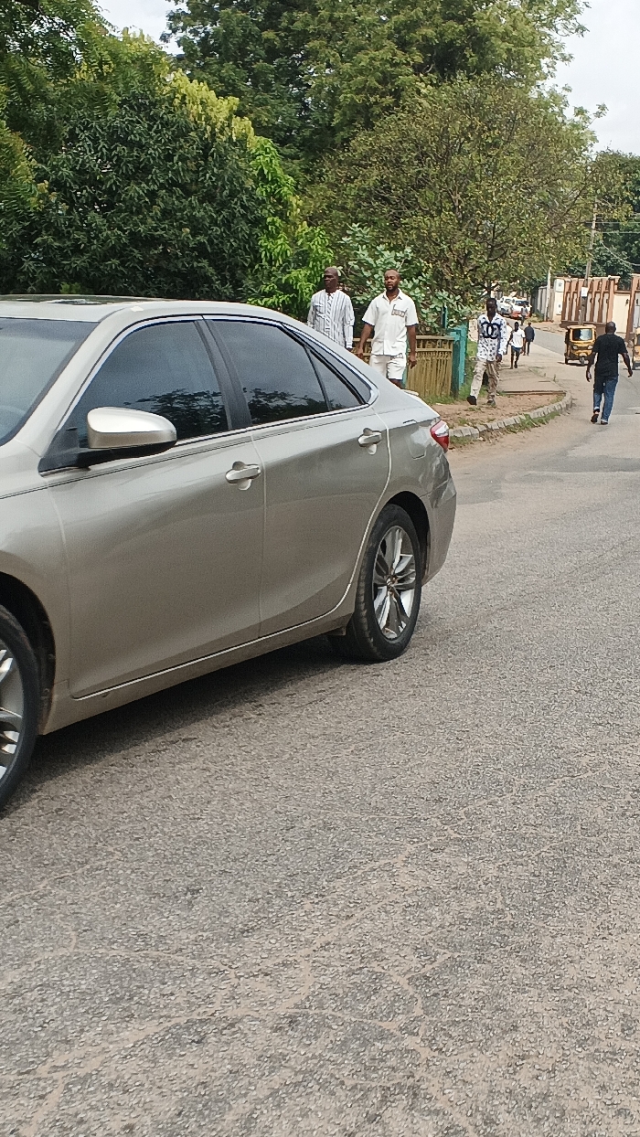 The image displays a street scene in Onitsha, Nigeria. A light gold sedan, likely a Toyota Camry, is prominently featured in the lower-left to central foreground, viewed from its left rear quarter. The vehicle has tinted windows, chrome door handles, and multi-spoke alloy wheels, and is positioned on an asphalt road with visible surface cracks. Behind the car, on a paved area adjacent to the road, two adult males walk side-by-side. The man on the left wears a striped long-sleeve shirt and dark pants. The man on the right wears a light-colored short-sleeve button-up shirt with "Bucci" text on the chest and matching shorts. Behind them, a dense line of green trees and bushes forms a natural barrier. Further down the curving road, another adult male walks in the same direction, wearing a white patterned long-sleeve shirt and light pants. Multiple additional figures are visible in the distance, including one in a dark shirt and blue jeans walking away from the viewer. A yellow Keke Napep (auto-rickshaw) is visible on the right side of the road, facing away. Various structures with brown elements, possibly fences or gates, and utility poles line the street. The sky above the tree line is overcast.