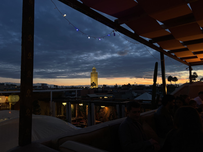 A rooftop view at dusk showcases a lit tower in the distance under a dramatic sky. String lights are strung above. A partial awning provides cover for the foreground, where people are seated in dim lighting. Palm trees are visible against the fading sunset.