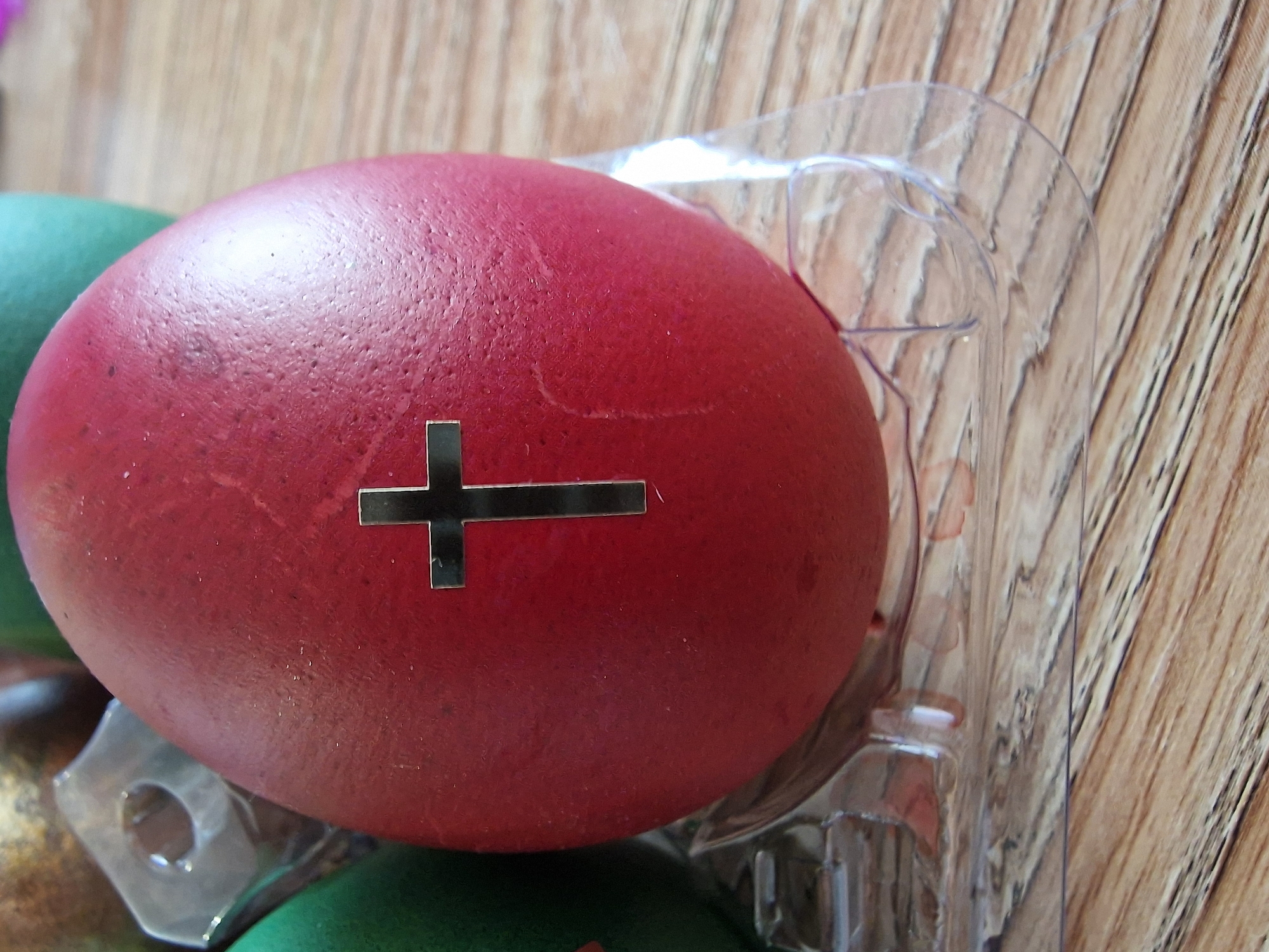 A close-up shot depicts a red Easter egg with a black cross affixed to its surface