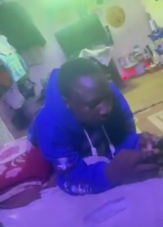 A dark-skinned person wearing a blue hooded sweatshirt is lying on their stomach on a white surface that appears to be a bed