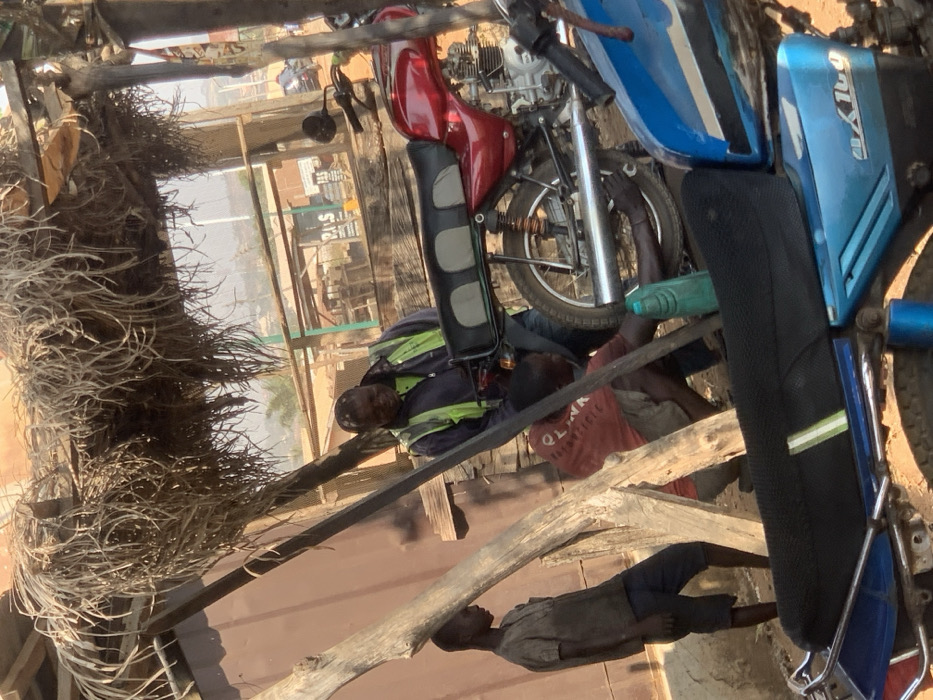 - "This image depicts an outdoor motorcycle repair scene in Gbeleko, Nigeria, under a makeshift shelter constructed from wooden poles and a dried palm frond roof" by FM-JIEGo1, licensed under CC BY 4.0