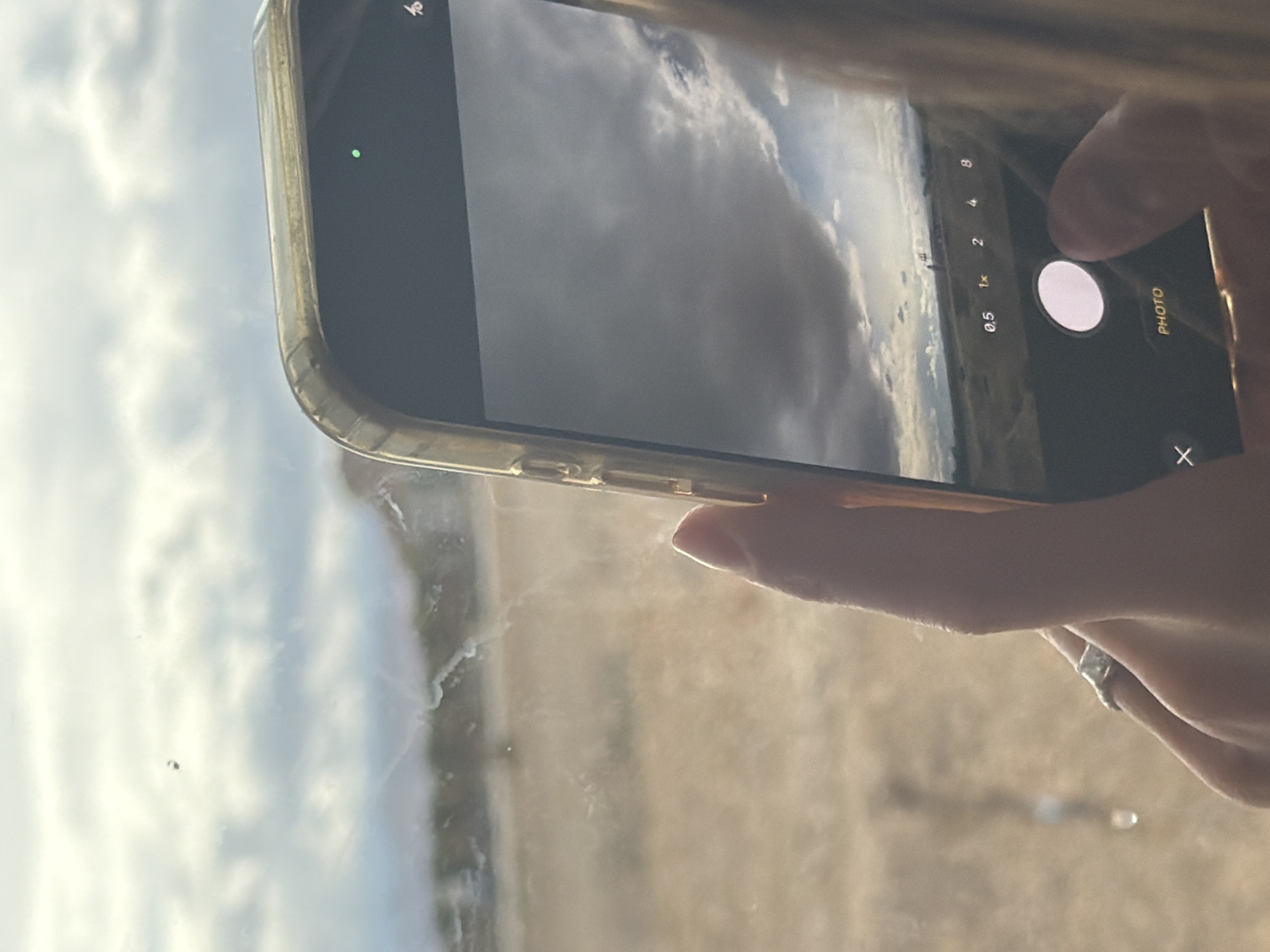 A close-up, angled shot depicts a person's hands operating a smartphone, capturing an outdoor landscape. The smartphone, enclosed in a clear, yellowed protective case, displays its camera interface, showing the "PHOTO" mode selected with zoom options (0.5x, 1x, 2x, 4x, 8x) and a large white shutter button. A green privacy indicator dot is visible at the top of the phone screen. The person's left hand, adorned with a silver ring on the ring finger, holds the phone, while the right thumb rests directly over the shutter button. A strand of light-colored hair is partially visible on the right edge of the frame. The view, both through a window or glass surface and mirrored on the phone's screen, reveals an outdoor environment under a partly cloudy sky with prominent grey and white formations. The landscape consists of arid, flat, or gently undulating terrain, characteristic of a desert region. Within the distant landscape visible on the phone's screen, a solitary dark, slender structure or figure stands on the horizon. Through the glass, a small dark object, possibly a bird or drone, is discernible against the sky. The glass surface itself is marked with smudges, streaks, and a distinct water droplet near the lower-left portion of the frame, where a faint, blurred, vertical reflection or image of an indistinct object or person is also present. This scene is situated in the Tamar Regional Council, Israel.