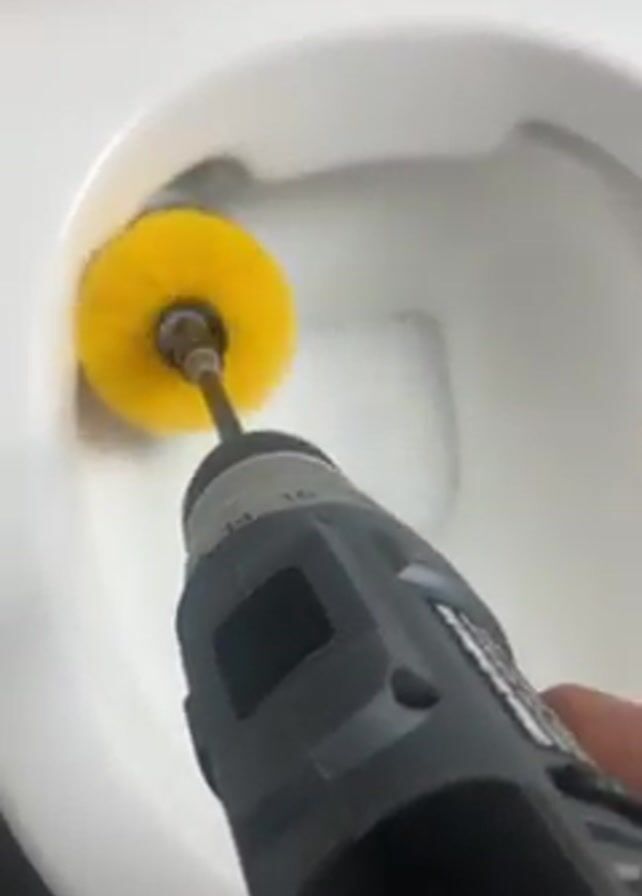 A hand uses a power drill with a yellow brush head to clean a white toilet bowl with foamy water inside. The toilet seat is up. The yellow brush spins rapidly, scrubbing the bowl.