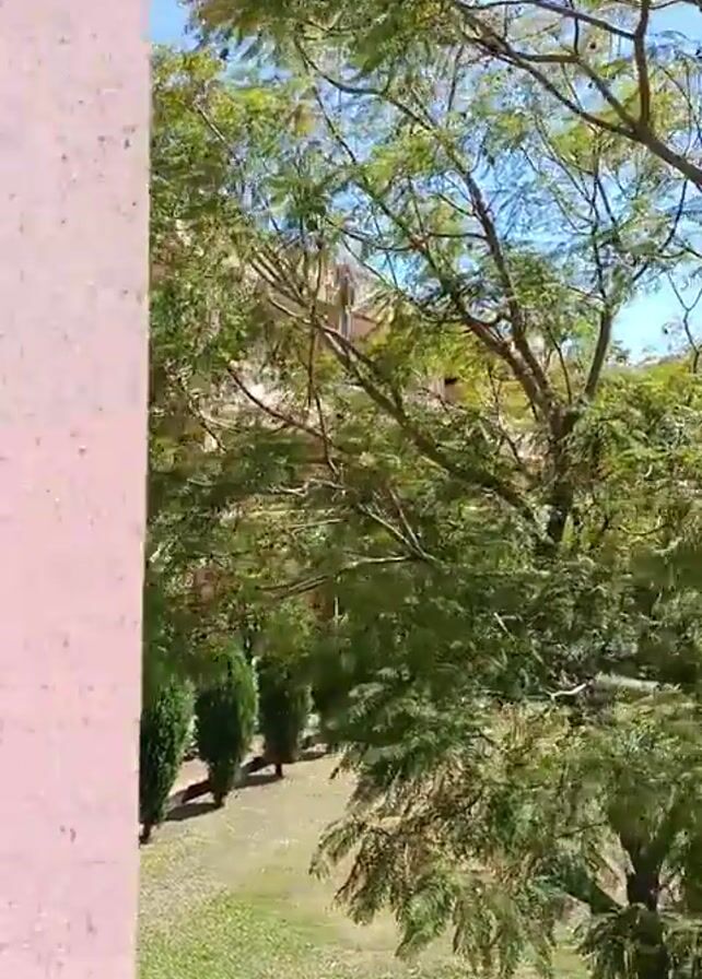 The camera pans from a tree to reveal a three-story building with a beige facade, pink accents, and a blue drainpipe. Clothes hang on the balcony. A row of small, conical evergreen trees line the lawn in front of the building, and other trees are scattered around. The sky is clear and blue. The building appears to be a dormitory or apartment complex.