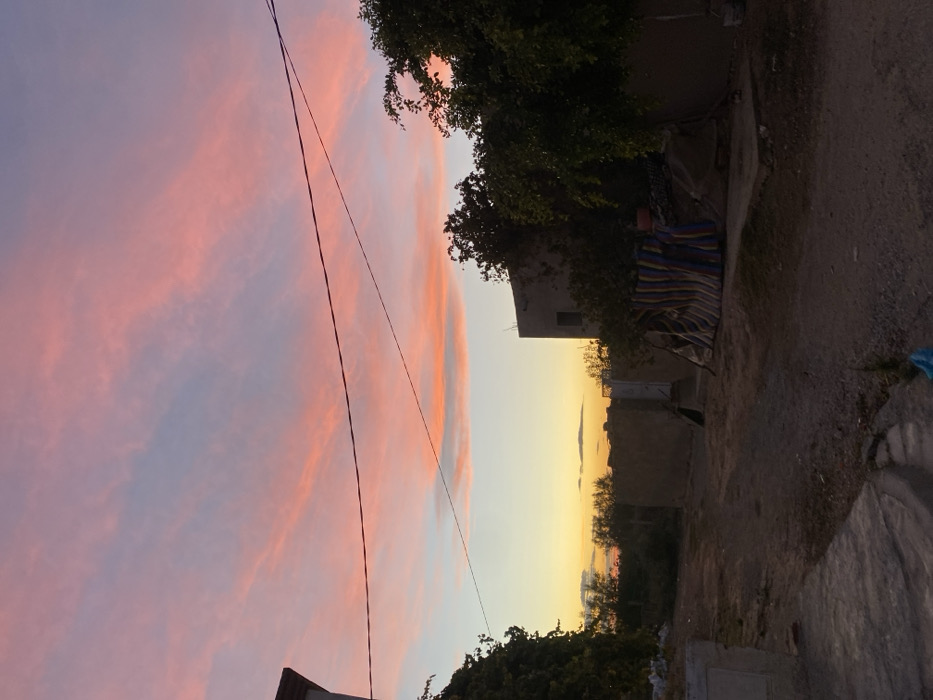 This image depicts a rural or semi-rural scene at sunset in الغنادة, Tunisia. The sky occupies the upper two-thirds of the frame, showcasing widespread cirrus or altocumulus clouds illuminated in vibrant pink and orange hues, transitioning to pale blue at the zenith and near the horizon. Two dark utility lines traverse horizontally across the mid-upper portion of the sky. The foreground features a dirt road or path extending from the lower center into the midground. On the left, a light-colored building corner with dark green climbing vegetation is partially visible. On the right, a small, dark animal, possibly a cat, is observed near a low wall. Adjacent to this, a makeshift shelter or tent constructed from vertically striped fabric (blue, yellow, white, brown) is propped against a wall. In the midground, a light-colored, multi-story building, likely a residence, stands partially obscured by dark green trees on the right. Additional scattered dark green vegetation and low walls are present across the midground. The distant horizon, visible below the vibrant sky, shows a band of yellow-orange light and silhouettes of more distant trees and structures. The overall lighting indicates twilight conditions, with the sun low in the sky, creating a warm glow.