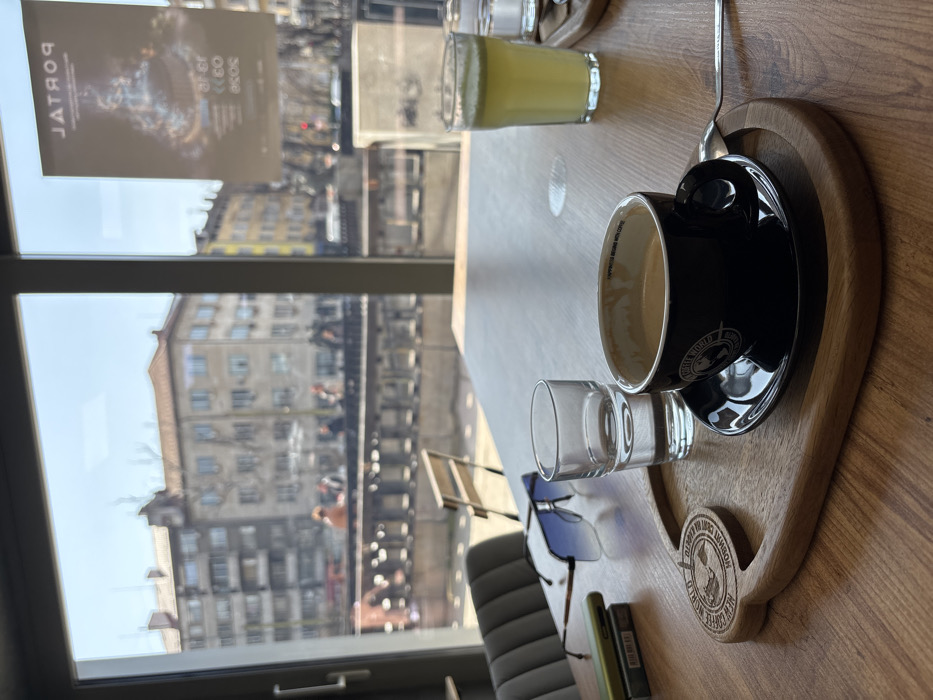 The image depicts an indoor scene looking out through large windows onto an urban streetscape in Gabrovo, Bulgaria, on a bright, sunny day. In the foreground, a light wooden table is visible. On the table, a black ceramic coffee cup, approximately half-full of espresso, rests on a matching saucer with a silver spoon to its right. This set is placed on a distinctive, light wooden tray with an engraved circular logo featuring the text "NEW COFFEE WORLD GABROVO." To the left of the coffee, a clear glass filled with water is present. Further left on the table are a pair of blue-tinted aviator-style sunglasses, a green smartphone, and a pack of cigarettes. To the right, a second clear glass contains a yellow-green beverage. Through the large window panes, a concrete promenade or bridge spans the midground, with several blurred figures of pedestrians walking. The structure of the bridge suggests it crosses a body of water, likely a river, below the visible frame. Beyond the promenade, various multi-story urban buildings with different facades and roof styles (some terracotta, some grey) line the street under a clear blue sky. Sparse trees are also visible. A poster is affixed to the right window pane, displaying an abstract blue and white design with the mirrored word "PORTAL" at the top, along with visible dates "19 / 18" and "03 / 2023". Inside, to the left of the table and behind the sunglasses, a grey upholstered chair with a fluted back is partially visible.