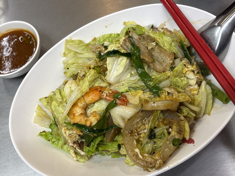 The image displays a meal served on a metallic surface, likely a tabletop, in Suthep, Thailand. The central subject is an irregularly shaped white ceramic bowl filled with a stir-fried dish. The dish consists primarily of wilted light green cabbage or lettuce, pieces of cooked shrimp (one prominent, curled orange shrimp is visible), slices of light-colored cooked meat (likely pork), translucent, wide, yellowish noodles (possibly glass noodles or rice noodles), scrambled egg fragments, and dark green leafy vegetables. Red chopsticks and a silver spoon are positioned diagonally across the lower right portion of the bowl, resting on the rim and partially contacting the food. To the upper right of the main bowl, a smaller, round white ceramic bowl contains a dark reddish-brown sauce. No individuals are visible in the scene. The overall lighting is bright and even.