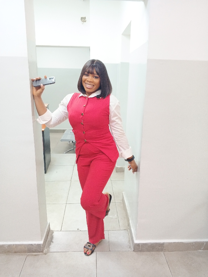 An adult Black female, appearing in her late 20s to mid-30s, stands in a doorway within an indoor, brightly lit environment. She possesses dark, shoulder-length bob hair with bangs and smiles directly at the viewer. She is attired in a red two-piece suit comprising a fitted vest with multiple gold-colored buttons and matching trousers, worn over a white long-sleeved collared shirt. Her footwear consists of dark slip-on sandals with a logo on the strap. A dark smartwatch is present on her left wrist, and a ring on her right ring finger. She holds a dark smartphone horizontally in her raised left hand, which rests on the white doorframe. Her right hand also rests on the white doorframe, and her right foot is slightly lifted. The location is characterized by clean white walls, a light-colored tiled floor, and baseboards. Through the doorway, a background area is visible, containing a light-colored metal bench and a dark, rectangular object, indicative of an office or waiting area.