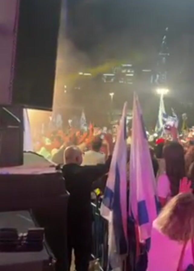 large crowd of people gathered at night, many waving Israeli flags. A man in a dark suit stands in the foreground, taking a photo with his phone of the crowd. A large speaker sits to his left, and city buildings are visible in the background. Yellow spotlights shine onto the crowd, adding to the energy of the scene. Some people are obscured by the flags, but it's clear that the crowd is dense and celebratory.