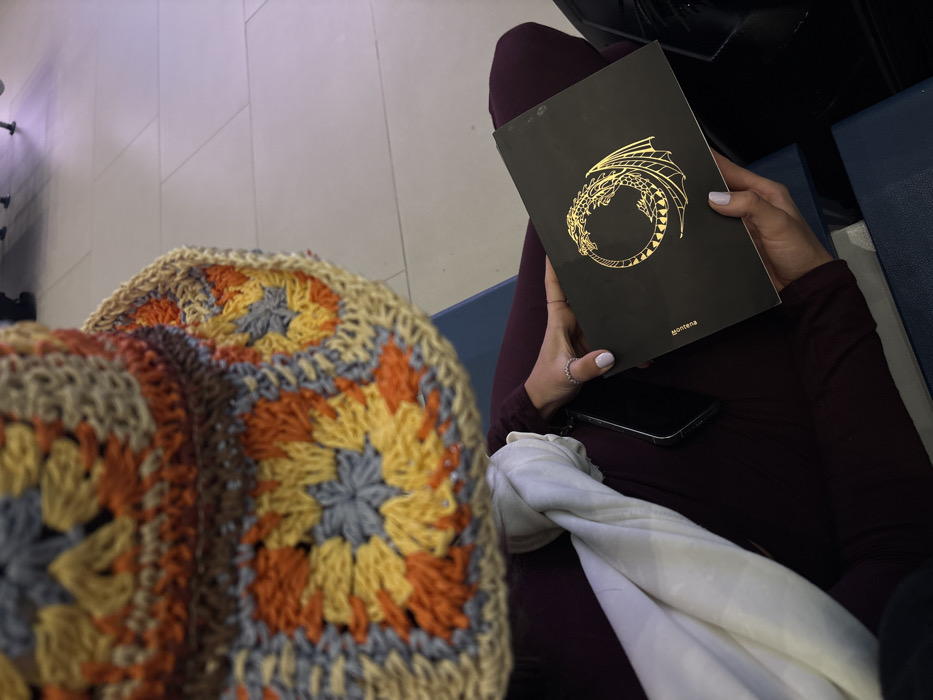 A person is holding a black book with a gold dragon design on the cover, partially obscuring their face. The book is labeled "montena" in small white font at the bottom. A smartphone is resting on their lap, draped with a white scarf. They're wearing a dark maroon top. A colorful, handmade crochet item with orange, yellow, and gray floral patterns sits on the left. They appear to be sitting on a blue surface, possibly a bench or chair.