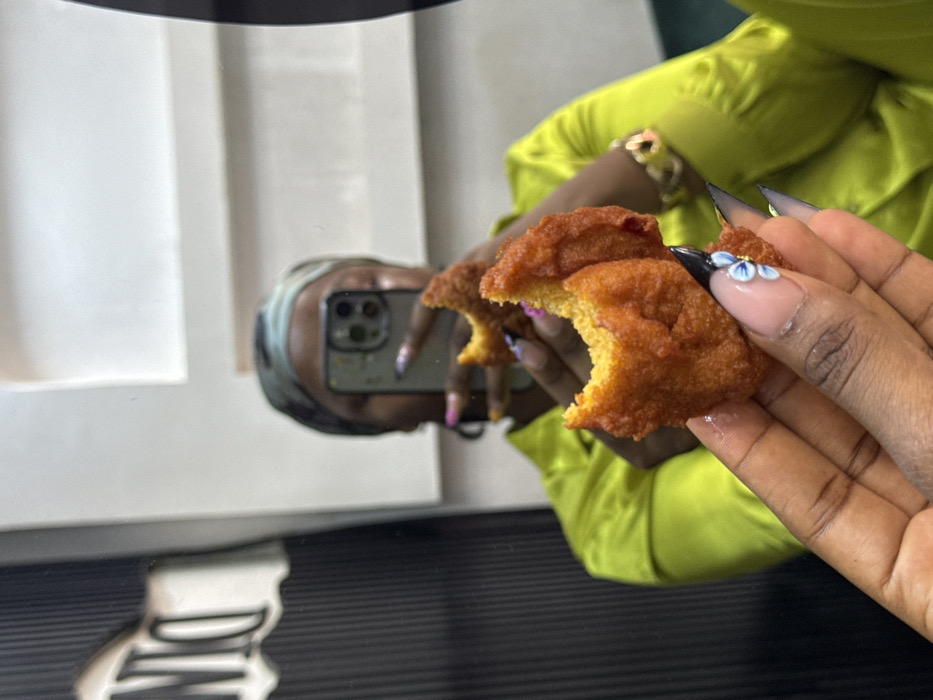 A person is captured in a mirror selfie holding two pieces of akara (fried bean fritters) in an indoor setting