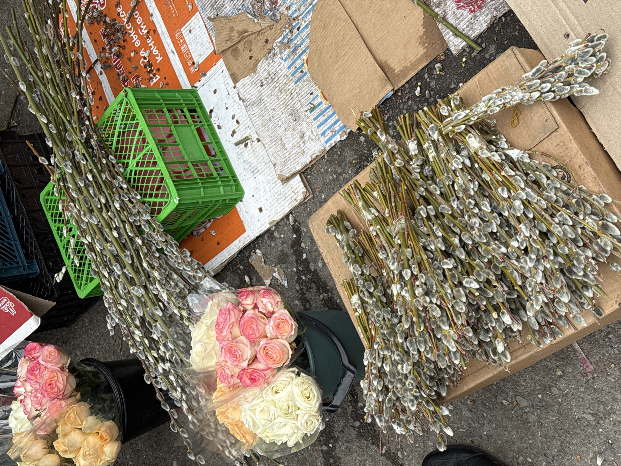 The image depicts a street-side flower market in Yerevan, Armenia. Several bunches of pussy willow branches are arranged near a pile of pink, white, and peach roses in buckets. Green plastic crates and cardboard boxes are scattered on the pavement, serving as makeshift displays. The scene appears to be a vendor's setup, with flowers and willow branches for sale. The pavement shows signs of wear and tear, suggesting a busy urban environment.